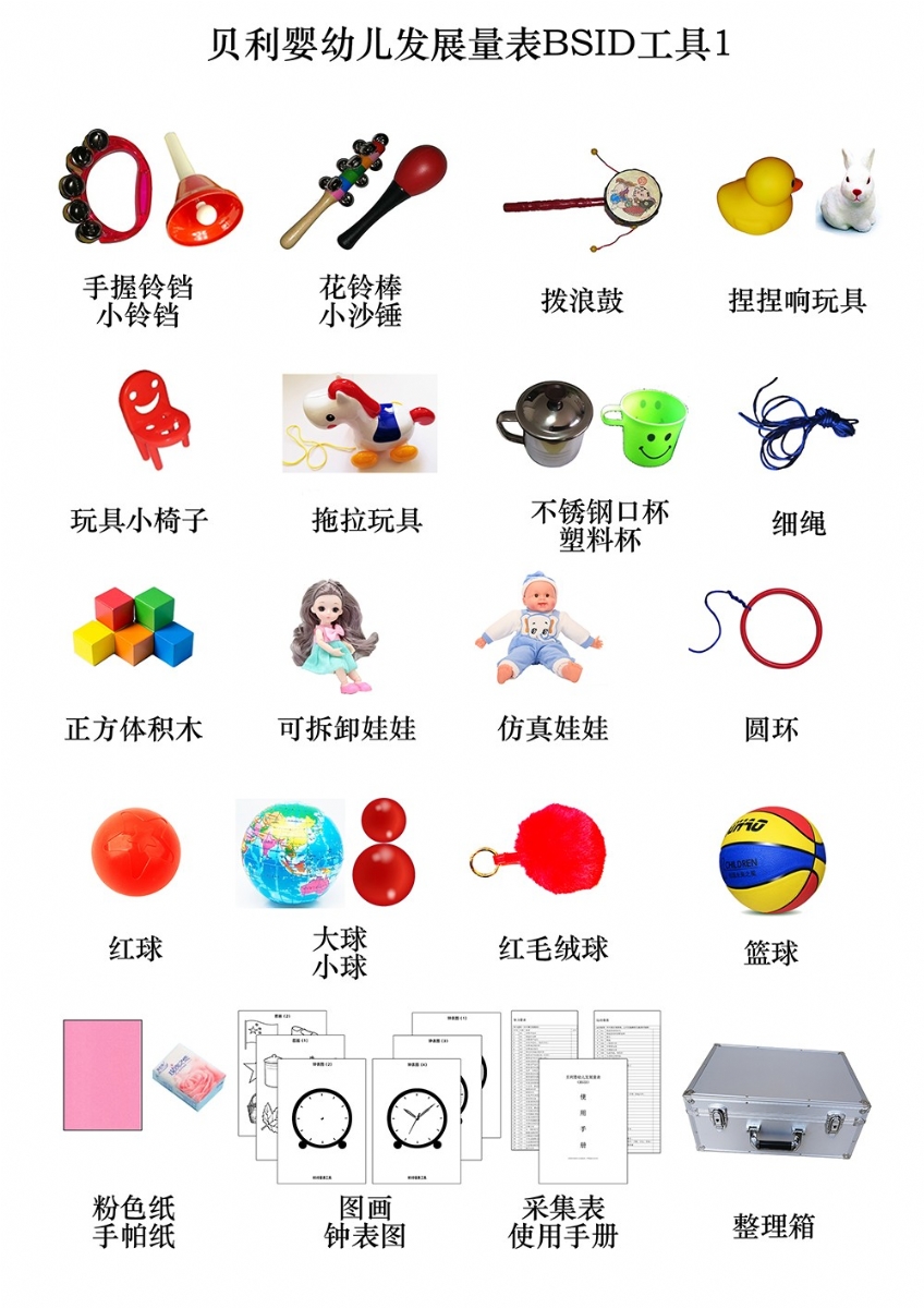 手握鈴鐺、小鈴鐺、花鈴棒、撥浪鼓、小沙錘、捏捏響玩具、玩具小椅子、拖拉玩具(帶線)、小正方體積木(紅12個(gè),黃藍(lán)綠各2塊)、可拆卸娃娃、布娃娃、圓環(huán)、紅球、大球、紅毛絨球、籃球、紅色小球、細(xì)繩、不銹鋼口杯、塑料杯、大號(hào)塑料藥瓶、小號(hào)塑料藥瓶、餐具套裝、大小方巾、方形鏡子、大木珠(帶孔)、小木珠(帶孔、)黃方珠子、塑料方盒、塑料圓盒、油畫(huà)棒、指揮棒、黃色鉛筆、秒表、手電筒、小鬧鐘、電燈開(kāi)關(guān)、頭圍尺、軟尺、木釘板、多孔型板(含圓形、方形、三角形各4塊)、幾何嵌板(含圓、三角、方形,厚8mm)、小人書(shū)識(shí)圖卡(果蔬、人物、動(dòng)物、交通等)、粉色卡紙、手帕紙、鐘表圖1234、圖畫(huà)12(BSID)、BSID采集表、BSID使用手冊(cè)、整理箱等。